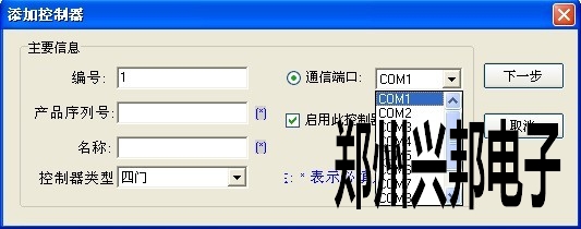 首先選擇好電腦的通訊端口,填寫(xiě)產(chǎn)品的序列號(hào)一般出廠默認(rèn)設(shè)置是0000,然后為設(shè)備起個(gè)名稱,選擇好所控制門(mén)的類型,最后點(diǎn)擊下一步,接著會(huì)彈出如圖七所示對(duì)話框。