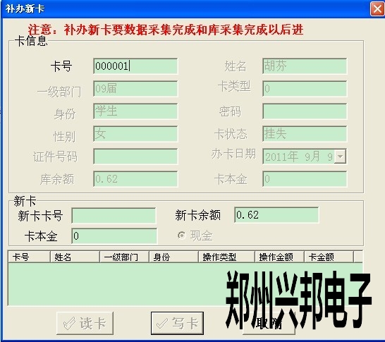 首先卡掛失(比如:卡號(hào)為000001),掛失后點(diǎn)卡管理-->補(bǔ)辦新卡,然后在卡號(hào)處輸入1,按回車鍵,此時(shí)會(huì)顯示出卡信息,如下圖所示