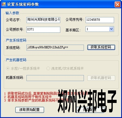 4) 系統(tǒng)密碼:跟卡的加密有關(guān),單擊【設(shè)置密碼】出現(xiàn)圖輸入卡的加密參數(shù)(根據(jù)公司所提供的信息填寫),單擊【獲取系統(tǒng)密碼】,單擊【保存配置】。將獲取的密碼粘貼到系統(tǒng)密碼后面的空白處。再次打開該窗口時(shí)可以單擊【讀取原始密碼】,獲得卡的加密信息。