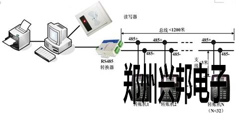 采用485通訊方式,如圖:485通訊須要自助轉賬機與電腦之間連線、距離不能超過1200米,自助轉賬機可以設在充值點旁邊,或食堂內(nèi)。