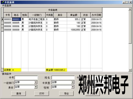 卡信息表主要用于查看卡的基本信息。可以選擇相應的條件,然后單擊【查詢】在表格中會出現(xiàn)相應條件的卡的基本信息,表的最下面顯示出所查詢出的總記錄數(shù)及庫金額匯總。