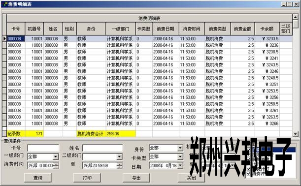 1)       消費(fèi)明細(xì)表:根據(jù)相應(yīng)條件查看卡的消費(fèi)明細(xì),表里顯示了卡的一些基本信息和消費(fèi)的時(shí)間,金額和卡上還有的余額。