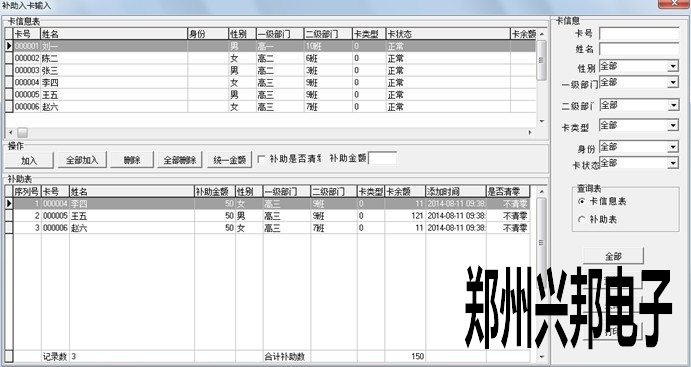 1.485軟件打開后,點(diǎn)一下卡管理--補(bǔ)助入卡--補(bǔ)助入卡輸入,打開補(bǔ)助入卡輸入窗口,在右卡信息中輸入想要添加的人員條件后,點(diǎn)擊下面的查詢,然后在左邊的補(bǔ)助金額后面的框中填寫補(bǔ)助金額,可以選擇是否清零,若選擇補(bǔ)助清零,在領(lǐng)取補(bǔ)助時(shí)會(huì)將卡上的金額先清零再補(bǔ)助上此次的金額;若選擇不清零,則在領(lǐng)取補(bǔ)助時(shí)會(huì)累加之前卡上的金額。點(diǎn)擊全部加入,就給選出來(lái)的人員生成補(bǔ)助.關(guān)閉此畫面,如下圖所示。