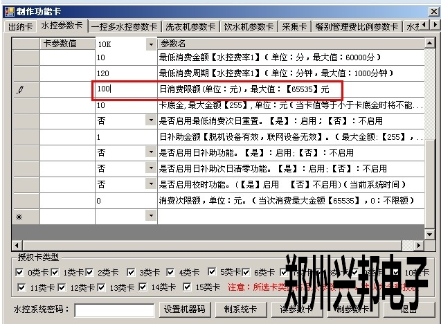 2)打開軟件 制卡中心-功能卡制作-水控參數(shù)卡中的日限額,輸入要設(shè)置的值,以元為單位,如下圖所示,代表100元,最大可設(shè)置到65535元,設(shè)置好后點(diǎn)擊制參數(shù)卡即可;
