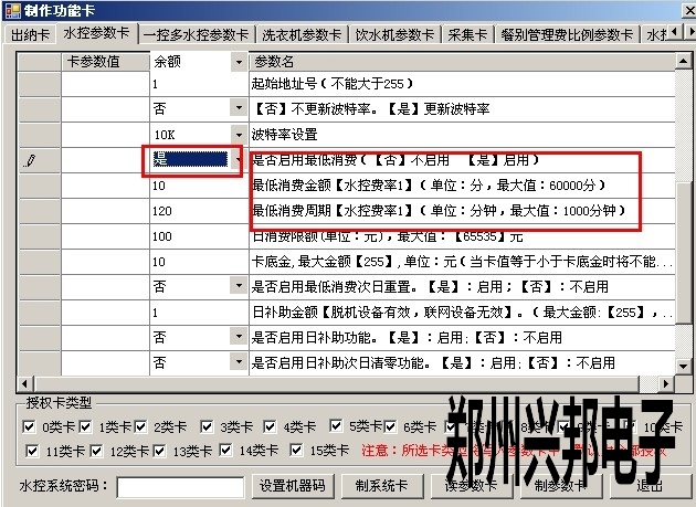 2)打開軟件 制卡中心-功能卡制作-水控參數(shù)卡中的最低消費周期,先選擇啟用,然后輸入最低消費金額和最低消費周期,最低消費金額以分為單位,最低消費周期以分鐘為單位,設(shè)置好后點擊制參數(shù)卡即可;