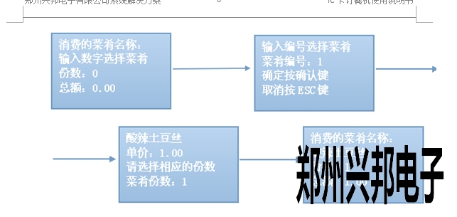 自動模式:輸入菜肴編號,點擊確認后選擇份數(shù),點擊確任后出現(xiàn)消費的菜肴名稱、份數(shù)、總額,將卡片放于刷卡區(qū),即可進行扣費,扣費后顯示扣費金額、手續(xù)費用、卡上余額、卡號,操作流程如下圖所示: