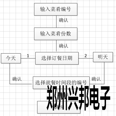 簡易模式下訂餐操作方法:輸入菜肴編號,點擊[確認]后輸入菜肴份數(shù),點擊[確認]后選擇訂餐日期(今天或者明天),點擊[確認]后選擇訂餐的時間段(共有12個時間段),輸入時間段編號點擊[確認]后,顯示訂餐的菜肴名稱、份數(shù)和總額,將卡放到刷卡區(qū),聽到滴的一聲響后即可訂餐成功,操作流程如下圖所示: