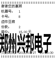 計算模式:輸入扣費金額,按[確認]鍵后,將卡片放于刷卡區(qū),即可進行扣費,若連接的有打印機,可直接打印消費明細,打印出的信息如下圖所示: