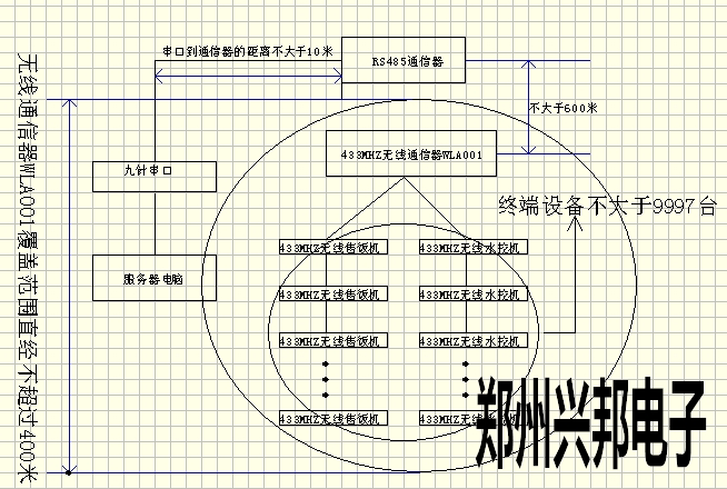 433MHZ無線通信器(WLA001)使用框圖如下所示,一個433MHZ無線通信器(WLA001)的無線覆蓋范圍為直經400米(空曠地區(qū));只要在收發(fā)的范圍內,可連接的終端設備的臺數(shù)理論上沒有限制;地址號9998、9999,終端設備不可用,系統(tǒng)使用;