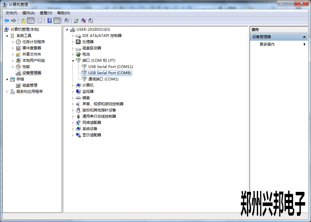 單擊計(jì)算機(jī)—單擊右鍵—管理—設(shè)備管理—端口。找到所用usb線(xiàn)端口。如下圖: