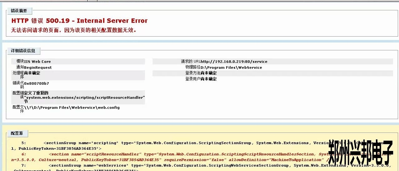 [文章內(nèi)容簡(jiǎn)介]:客戶(hù)使用的互聯(lián)網(wǎng)一卡通食堂售飯機(jī),在裝好軟件后配置有誤,瀏覽service時(shí)提示應(yīng)用程序中的服務(wù)器錯(cuò)誤.