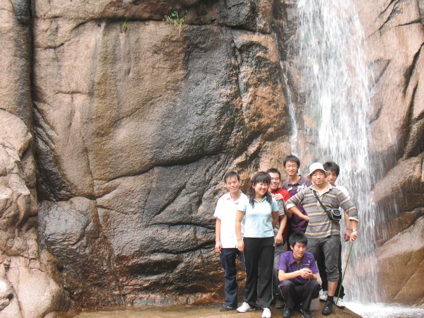 技術部員工在畫眉谷紅石瀑合影。